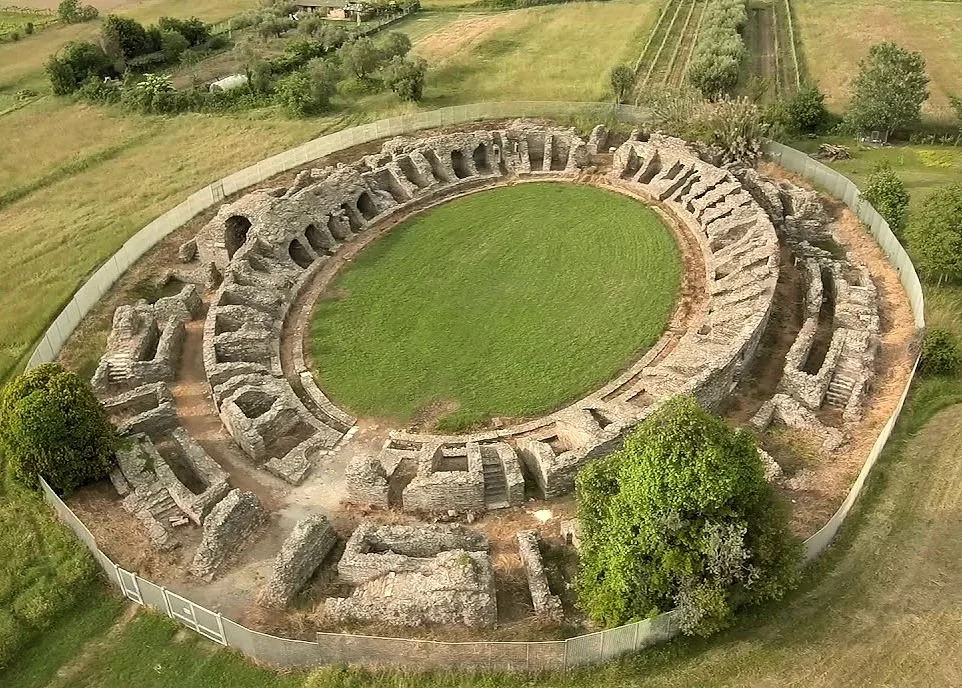 The arena lies about 250 metres from the city gate on the Via Aurelia Nova. It is 88.5 metres long and 70.2 metres wide and had a capacity of about 7,000. After the end of the Western Roman Empire in the 5th century, the complex was used as a quarry but this stopped once the site was abandoned. At first sight it looks as if the ground level within the arena is a couple of metres higher than its original level because the lower slopes of the supporting structure for the front of the seating appear to be level with it. However the amphitheatre, although without underground vaults, had a moat separating the audience at the front from the action.